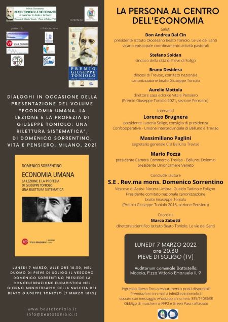 Saluti Don Andrea Dal Cin presidente Istituto Diocesano Beato Toniolo. Le vie dei Santi Stefano Soldan sindaco della città di Pieve di Soligo Bruno Desidera diocesi di Treviso, comitato nazionale canonizzazione beato Giuseppe Toniolo Aurelio Mottola direttore casa editrice Vita e Pensiero (Premio Giuseppe Toniolo 2021, sezione Pensiero) Interventi Lorenzo Brugnera presidente Latteria Soligo, consiglio di presidenza Confcooperative - Unione interprovinciale di Belluno e Treviso Massimiliano Paglini segretario generale Cisl Belluno Treviso Mario Pozza presidente Camera Commercio Treviso Belluno presidente regionale Unioncamere Veneto Conclude l'autore S.E . Rev.ma mons. Domenico Sorrentino Vescovo di Assisi- Nocera Umbra- Gualdo Tadino e Foligno Presidente comitato nazionale canonizzazione beato Giuseppe Toniolo (Premio Giuseppe Toniolo 2016, sezione Pensiero) Coordina Marco Zabotti direttore scientifico Istituto Beato Toniolo. Le vie dei Santi